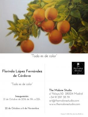 Todo es color. O mejor dicho, todo es de color, mezcla de colores primarios apadrinados por la luz que los baña. Tan fácil de afirmar como difícil de conseguir cuando de llevar esos colores al lienzo se trata. Pocos maestros han logrado dar vida a través de su pintura a una luz fecunda y ubérrima, que alegre colores y almas. Florinda López lo consigue, magistral e innovadoramente, en las obras que componen esta soberbia exposición. Todo es de color nos sorprende, nos alegra, nos evoca, nos seduce, nos enamora. Su pintura, a través de los sentidos, atraviesa el corazón e hiere a nuestra alma. Una fiesta sensorial tan fácil de percibir como compleja de teorizar, ya que esta pintura va mucho más allá, como veremos, del simple goce sensual. Estas líneas breves intentan que avancemos juntos en el camino alumbrado por sus flores, naranjos, paisajes y retratos.